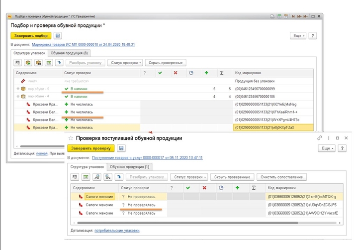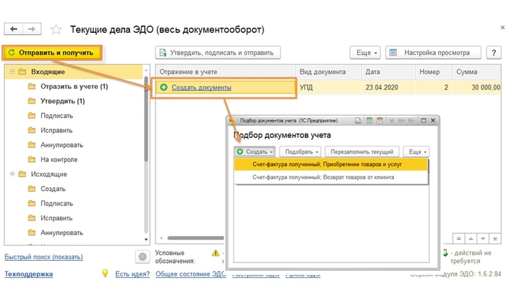 Далее переходим к изучению вопроса оптовой покупки маркируемой продукции. Переходим в «Покупки» — «Текущие дела ЭДО» — нажимаем «Отправить и получить». После получения и подписания извещений документ попадает в две вкладки: «Отражение в учёте» и «Утвердить» (рис. 7). Рассмотрим момент отражения документа учёта с маркируемой продукцией. Нажимаем «Создать документ» — документ реализации заполняется автоматически на основании электронного документа (при получении первого документа от поставщика с новой номенклатурой потребуется её сопоставление) — переходим в документ, дважды щёлкнув —нажимаем на гиперссылку «Подбор и проверка продукции» и сканируем поступивший товар. Все позиции должны стать со статусом в наличии — нажимаем «Завершить подбор» — проверяем остальные поля в документе, и можно проводить документ учёта. Далее возвращаемся в «Текущие дела ЭДО» — «Электронное представление документа» (столбец «Вид документа») — нажимаем «Утвердить» — «Подписать и отправить».