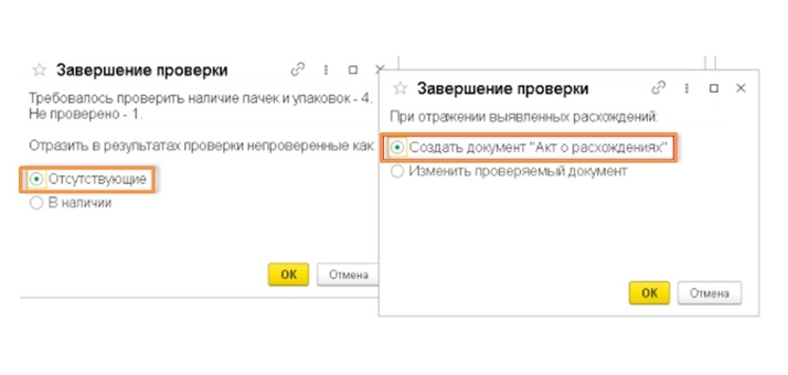 Но что же делать, если не все позиции при подборе получили статус в наличие (рис. 8)? В случае если код маркировки получил статус «не числилась», что поставщик прислал маркированный товар, но не указал код в электронном документе. А если товар остался со статусом «не проверялась» (статус устанавливается по умолчанию), это значит, что поставщик добавил код в документ, но не прислал товар. В таком случае при нажатии «Завершить подбор» выходит окно завершения проверки (рис. 9), где необходимо выбрать пункт «Отсутствующие» и сформировать акт о расхождении. Автоматически будет создан документ учёта, который можно будет отправить поставщику по ЭДО.