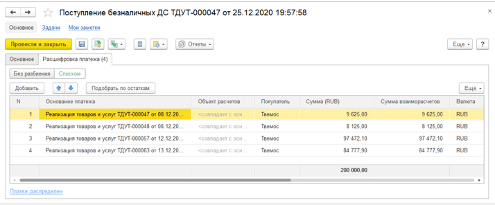 Рассмотрим данную ситуацию на примере: клиенту было оформлено несколько документов на отгрузку в кредит (документы Реализация товаров и услуг). После этого покупатель перечислил денежные средства в размере 200 000 рублей на наш расчетный счет. Распределим полученный платеж по конкретным документам отгрузки. Для этого оформим платежное поручение на данную сумму, указываем контрагента и расчетный счет, на который перечислены денежные средства, заполним сумму оплаты. Поскольку сумму оплаты требуется распределить по конкретным накладным, в документе «Поступление безналичных ДС» необходимо заполнить список документов, по которым прошла оплата. Для автоматического подбора документов необходимо перейти на закладку «Расшифровка платежа» и установить переключатель в положение «Списком». Для автоматического распределения оплаты по накладным используется команда «Подобрать по остаткам». Программа автоматически распределит сумму оплаты (по принципу ФИФО) и установит отметки у тех накладных или заказов, если накладная оформлена по заказу, которые необходимо оплатить. Для переноса информации о накладных в документ необходимо нажать кнопку «Перенести в документ». После проведения документа будет полностью погашен долг по первым трем накладным, долг по четвертой накладной будет погашен частично. Этот долг будет учтен при последующих платежах от покупателя.