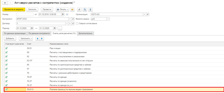 Далее необходимо в Акте сверки взаиморасчетов на вкладке Счета взаиморасчетов добавить счет 76.01.9 и заполнить документ, операции по данному счету появятся в документе.