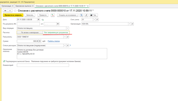 Для микропредприятий на УСН в документе «Списание с расчётного счёта» появляется поле «Без закрывающих документов», то есть учёт ведётся кассовым методом, без ФСБУ, формируется проводка Дт 26 Кт 51.