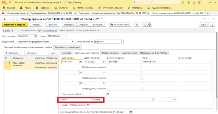 Раздел «Зарплата» – «Больничный лист» создаем больничный лист в обычном порядке, только в строке «Приступит к работе» ничего не указываем, в троке «Иное» указать код 34 «умер». Формируем заявление и реестр прямых выплат ФСС, проверяем персональные данные сотрудника, указываем банковские реквизиты сотрудника, родственники смогу получить деньги предоставим свидетельство о смерти и документы, подтверждающие родство с умершим.