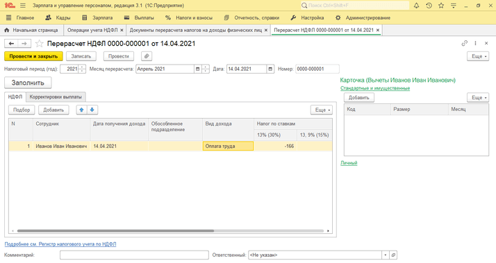 Т.к. программа автоматически исчисляет НДФЛ, то скорректируем его вручную с помощью документа «Перерасчеты НДФЛ» и «Операции учета НДФЛ».