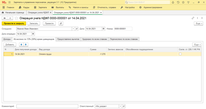 Раздел «Налоги и взносы» – «Операции учета НДФЛ» – заполняем закладки «Доход» и «Исчислено по ставке 13%» суммы ставим с минусом.