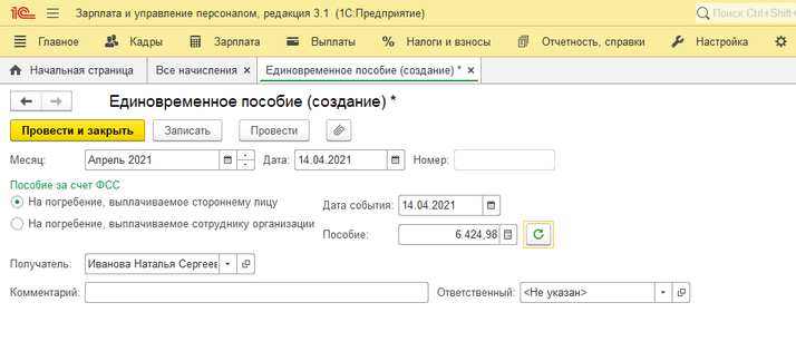 Раздел «Зарплата» – «Все начисления» - «Единовременное пособие за счет ФСС» - выбираем «На погребение, выплачиваемое стороннему лицу».