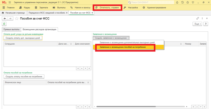 Раздел «Отчетность, справки» – «Передача в ФСС сведений о пособиях» - закладка «Возмещение расходов организации».