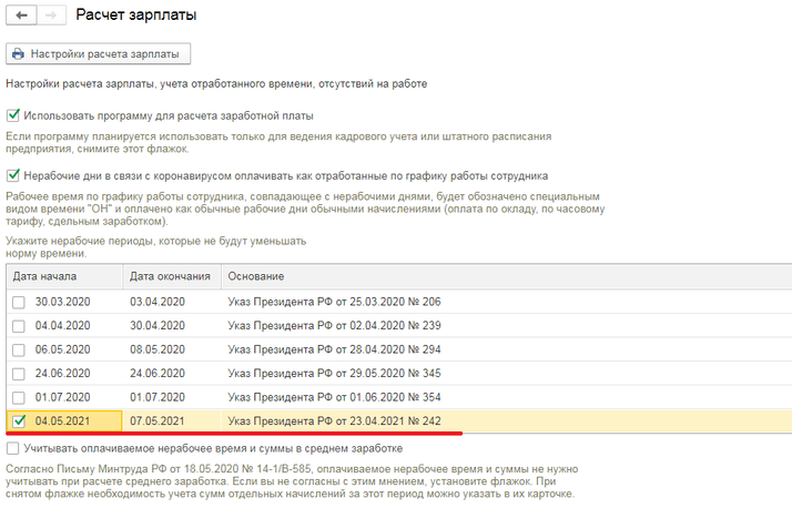 В связи с последним Указом Президента РФ от 23.04.2021 № 242 «Об установлении на территории Российской Федерации нерабочих дней в мае 2021 года» всех работодателей волнует вопрос по работе в майские праздники. В данной статье мы рассмотрим законодательную сторону вопроса и как отразить это в программе 1С:Зарплата и управление персоналом ред. 3.1.