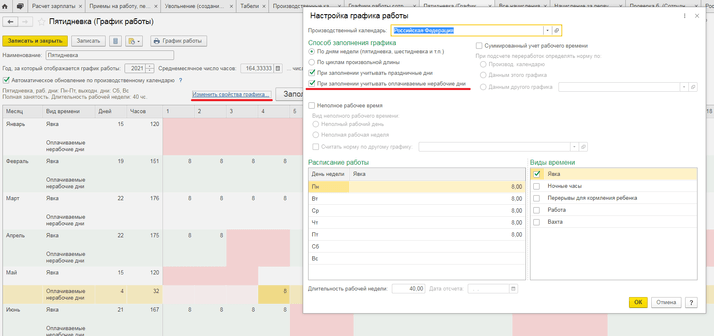 После зайдите в раздел «Настройка» — «Графики работы сотрудников», зайдите в каждый график, по которому в эти дни подразумевается оплачиваемый нерабочий день, нажмите кнопку «Изменить свойства графика» и проверьте, стоит ли галочка «При заполнении учитывать оплачиваемые нерабочие дни» (рис. 2).