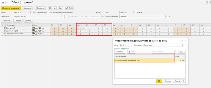 Если настройка стоит, то просто перезаполните график. В табеле учёта рабочего времени автоматически будет проставлен код «ОН» (рис. 3).
