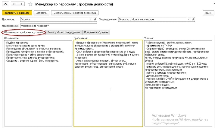В ней заполняются обязанности сотрудника, какими качествами для выполнения этих обязанностей он должен обладать, и предлагаемые условия работы (испытательный срок, заработная плата, график работы). Для исключения однотипных операций кадрового работника в программе 1С:ЗУП предусмотрена библиотека функций, выполняемых работниками. Туда включены типовые операции для сотрудников, например: «Заключает договора» или «Звонит потенциальному клиенту» и т. п.