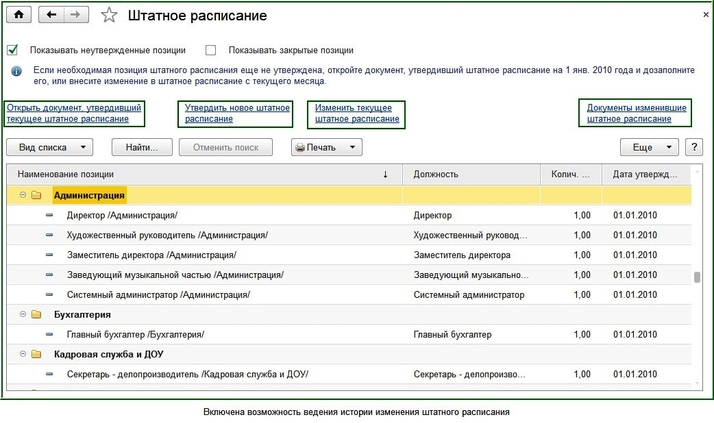 Штатное расписание с указанием подразделений, должностей, количества штатных единиц, окладов и т. п. формируется либо при первоначальной настройке программы ZUP, либо переносится из предыдущих версий программы.
