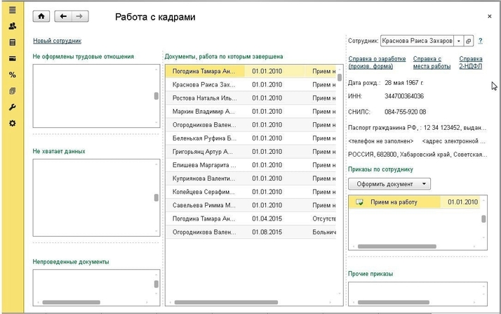Программа 1С:ЗУП с момента приёма сотрудника на работу до его увольнения позволяет в автоматическом режиме сформировать все необходимые документы, отражающие его трудовую деятельность. Исключается опасность, что не заполнена какая-либо справка, приказ или карточка по сотруднику.