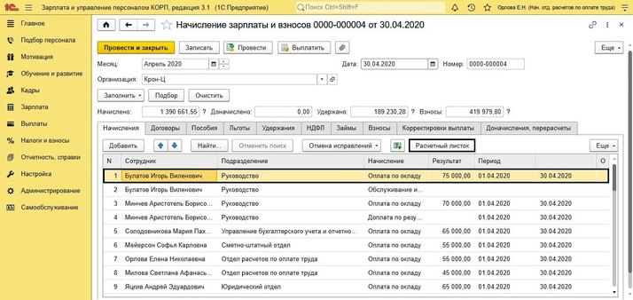 Итоговая операция месяца ‒ это начисление заработной платы и расчёт налогов и взносов из фонда оплаты труда. Для корректного формирования ведомости по оплате труда и другим выплатам в программе уже должны быть проведены все операции по кадровым изменениям, оформлен учёт рабочего времени и разовые выплаты.