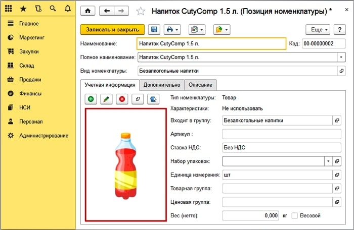 Один из самых важных справочников программы. В нём содержатся сведения о реализуемых товарах: наименование, единица измерения, артикулы, страна происхождения, виды упаковок. Возможен ввод текстового описания или изображения товара (рис. 2).