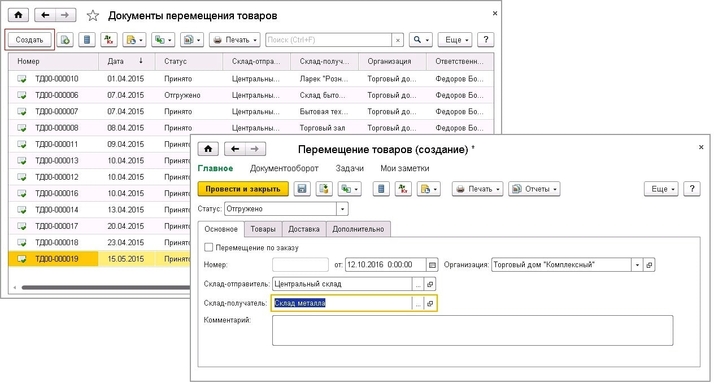 При централизованных поставках товар от поставщика поступает на центральный склад или терминал, а уже оттуда менеджеры распределяют его по торговым точкам на основании заявок товароведов или исходя из данных анализа продаж. Для учёта товаров создаётся документ на перемещение товаров (рис. 3).