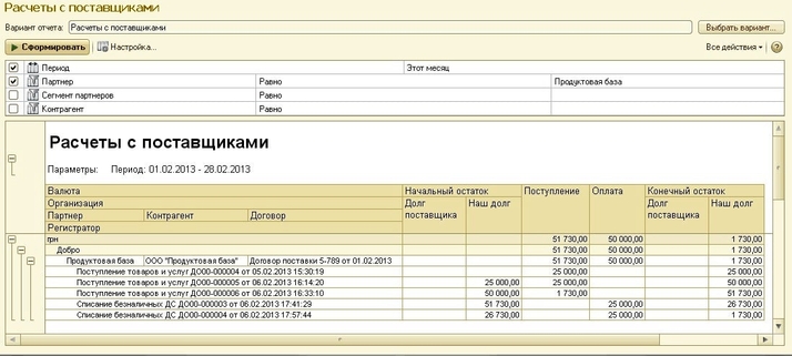 Контроль поступления товаров непосредственно с поставщиками и планирование расчётов ведётся в подсистеме «Закупки».