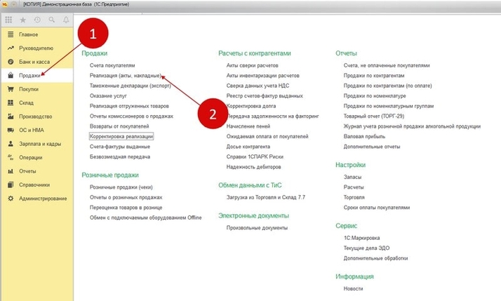Инструкция, как правильно сделать возврат товаров от клиента. Сначала нужно зайти в «Продажи» и нажать «Реализация».