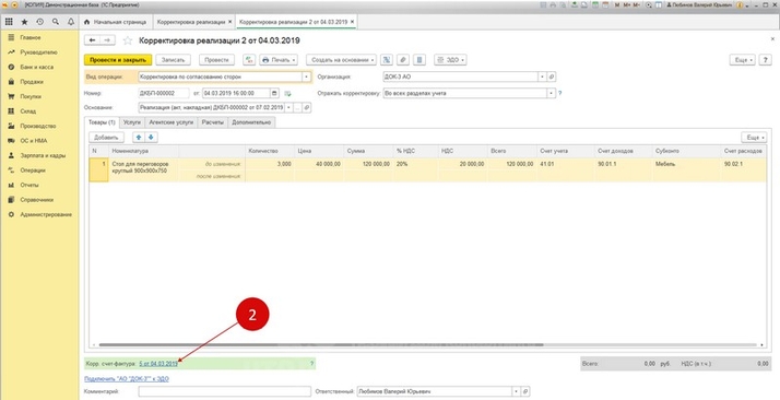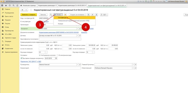 Для распечатки нажмите на документ. Появится окошко, в котором нужно инициировать распечатку документа и выбрать счёт либо универсальный «кордок». Один экземпляр документа нужно передать покупателю/клиенту, чтобы он откорректировал НДС.