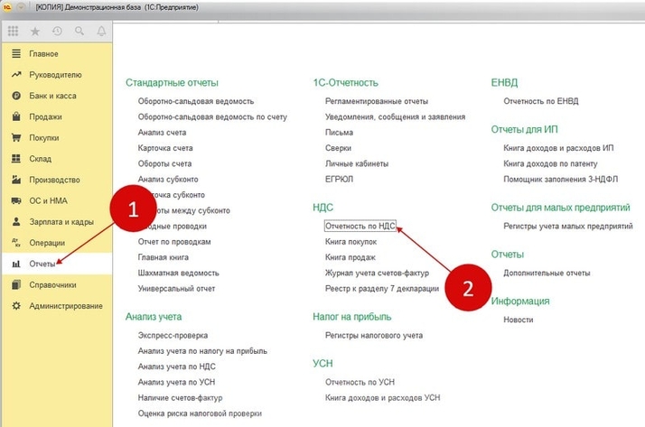 Для операции по НДС заходим в «Отчёты» и кликаем на «Отчётность по НДС».