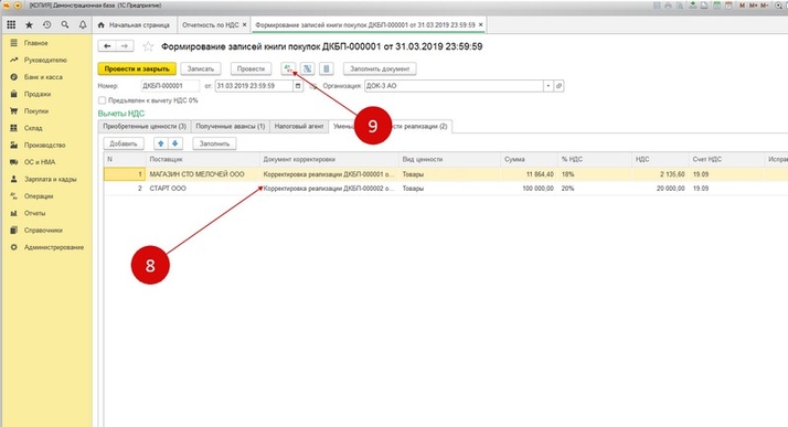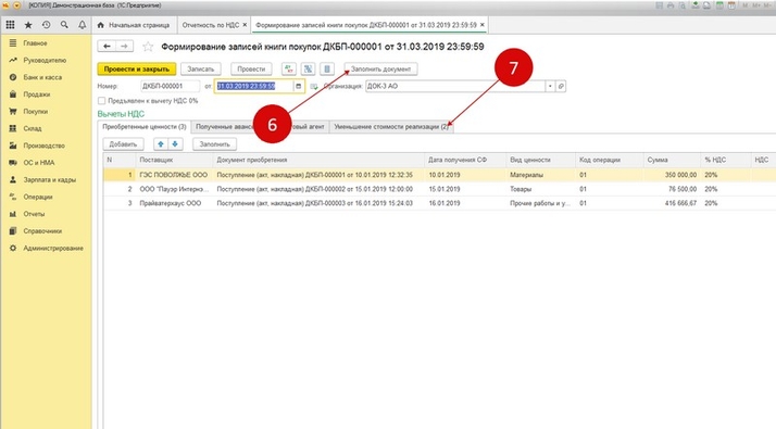 Появится форма, в которой нажимаем «Заполнить документ». Произойдёт самозаполнение документа. Переходим в «Уменьшение стоимости реализации».