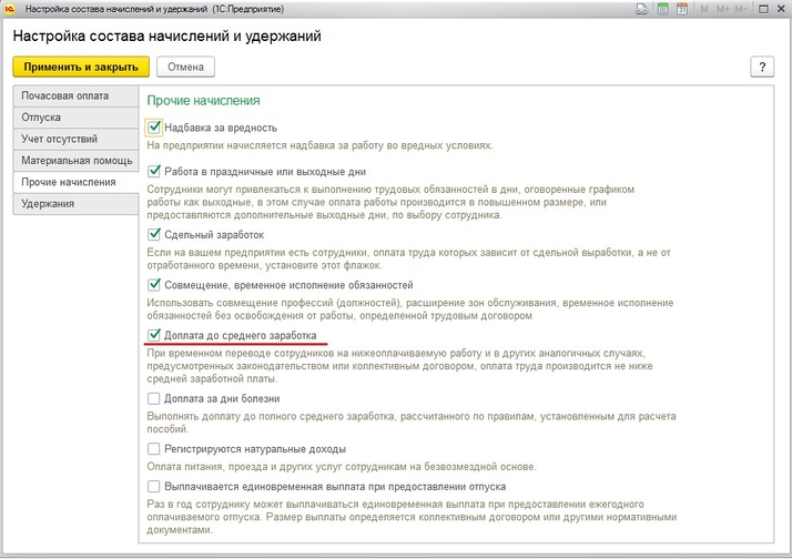 В первую очередь оформляется документ «Кадровый перевод» (раздел «Кадры» – «Приемы, переводы, увольнения» - создать), где отражаются изменения подразделения, должности, графика или оплаты труда. Далее необходимо перейти в раздел «Настройка» – «Расчет зарплаты» – ссылка «Настройка состава начислений и удержаний» – закладка «Прочие начисления» и установить флажок «Доплата до среднего заработка». В результате сохранения данной настройки в списке начислений (раздел «Настройка» – «Начисления») будет доступен вид начисления «Доплата до среднего заработка».