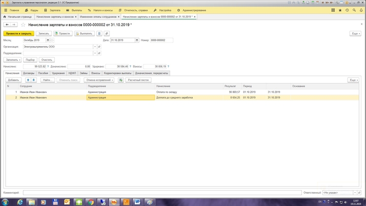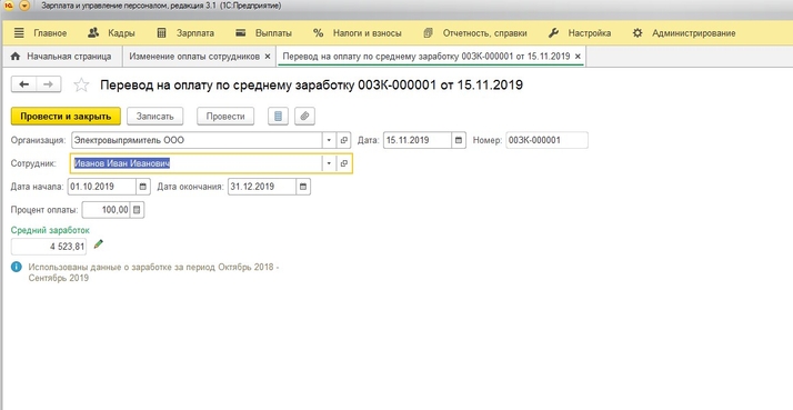 Доплата до среднего заработка начисляется и рассчитывается с помощью документа "Начисление зарплаты и взносов" (раздел Зарплата – Начисление зарплаты и взносов).