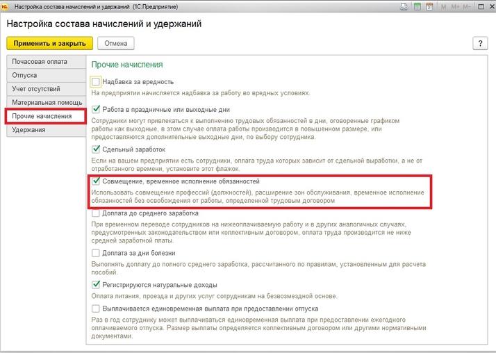 Совмещение профессий должностей в программе регистрируется с помощью документа «Совмещение должностей». Данный документ появляется в программе, если в настройках установлен флажок «Совмещение, временное исполнение обязанностей». Он находится в разделе «Настройка» - «Расчет зарплаты» - переходим по сылке «Настройка состава начислений и удержаний» - вкладка «Прочие начисления».