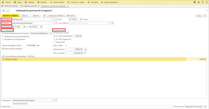 После создания документа внесите все необходимые данные по совмещению: укажите организацию, сотрудника, у которого будет совмещение, период совмещения, а также вид совмещения и размер доплаты.