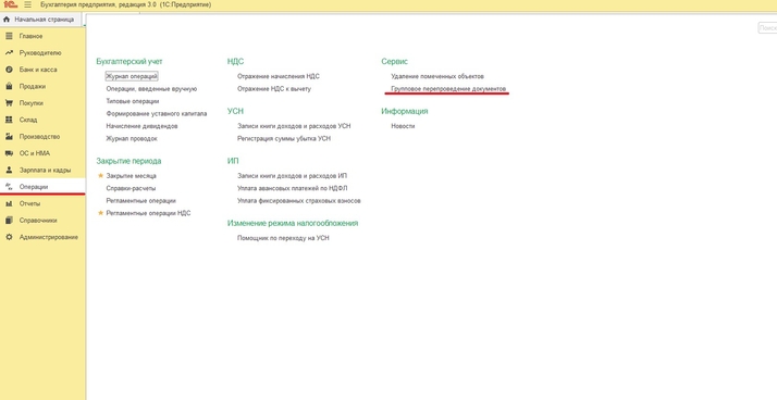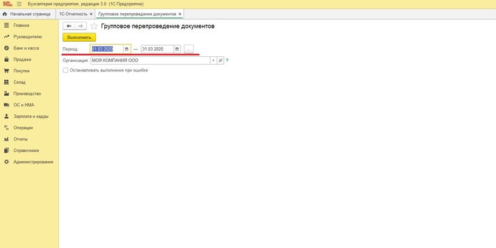 В программе Бухгалтерия предприятия, перед закрытием месяца для восстановления правильной последовательности проведения документов можно воспользоваться обработкой "Групповое перепроведение документов". Для этого заходите в раздел «Операции» – «Сервис» – «Групповое перепроведение документов» (рис.1). Устанавливаете период проведения документов (рис.2), выбираете необходимую организацию и нажмите кнопку "Выполнить".