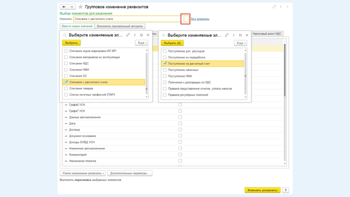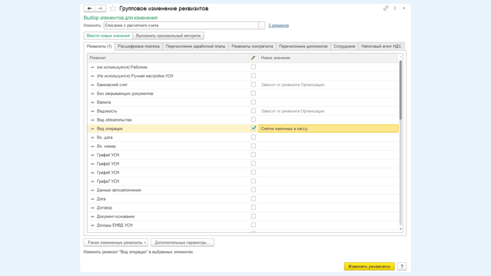 Чтобы изменить вид операции в определенных банковских выписках, необходимо перейти через раздел «Администрирование» в Обслуживание. Во вкладке «Корректировка данных» переходим по ссылке «Групповое изменение реквизитов». В графе «Выбор элементов для изменения» выбираем необходимый вид документа – Списание с расчетного счета или Поступление на расчетный счет. По ссылке «Все элементы» делаем отбор по виду операции, в котором указываем вид, который необходимо изменить. В табличной части выбираем реквизит «Вид операции» для изменения, ставим флажок рядом с ним и указываем вид, на который необходимо изменить выбранный в отборе.