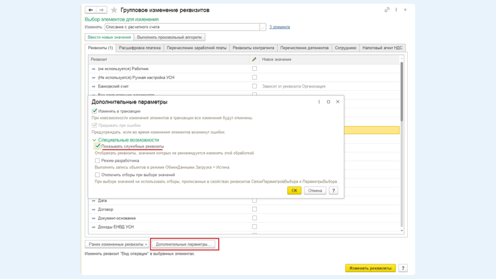Если реквизита в табличной части нет, то нажимаем на «Дополнительные параметры». Внутри вкладки «Специальные возможности» устанавливаем флажок «Показывать служебные реквизиты». После появления необходимого реквизита в списке повторяем описанные ранее действия и нажимаем «Изменить реквизиты».