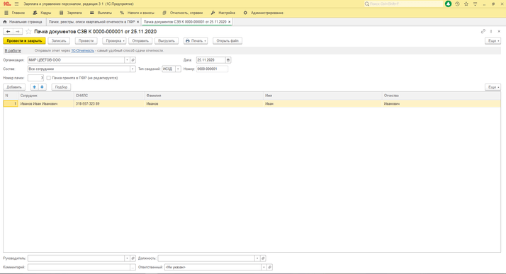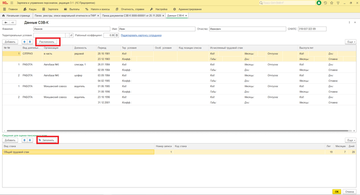 По кнопке «Подбор» выбрать сотрудника, двойным щелчком мыши открыть данные СЗВ К, заполняем вручную таблицу сверху. Далее нажимаем кнопку «Расположить» встает автоматическая нумерация строк. Далее нажимаем кнопку «Заполнить» заполняется табличная часть «Общий трудовой стаж» - Ок – Провести и закрыть. Отчет готов к отправке!