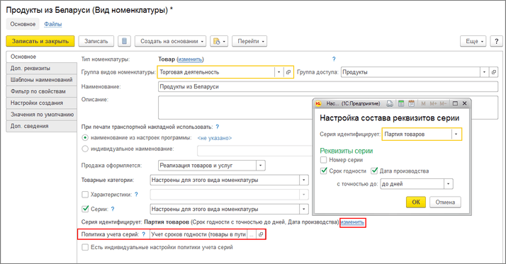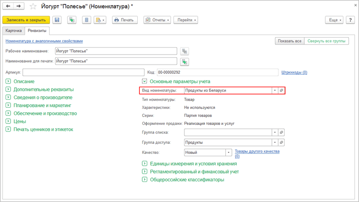 На закладке «Товары» укажите товары, которые относятся к виду номенклатуры «Продукты из Беларуси».