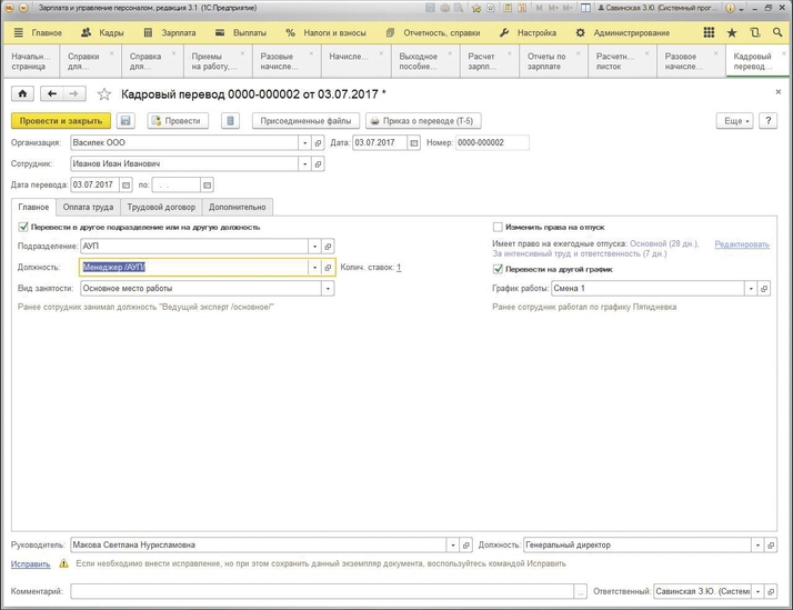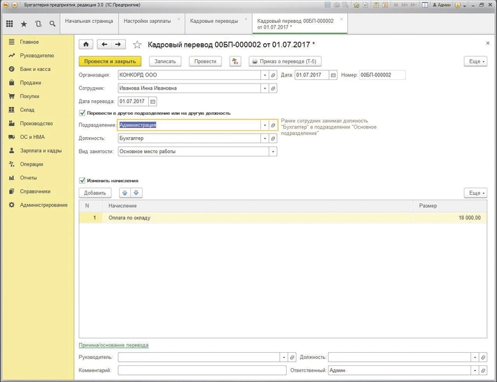 Оформление перевода с помощью документа «Кадровый перевод», «Кадровый перевод (списком)» осуществляется как факт перевода сотрудника (сотрудников) на другое место работы. Для этого необходимо зайти в раздел «Кадры ‒ Приёмы, переводы, увольнения», далее с помощью кнопки «Создать» выбрать из списка документ «Кадровый перевод». Затем в поле «Организация» необходимо указать организацию, выбрав из справочника организаций, в которой регистрируется данный кадровый перевод. В том случае, если сотрудник оформлен в обособленном подразделении на отдельном балансе, то данное обособленное подразделение необходимо отразить в качестве организации. Далее в поле «Дата» указываем дату документа, номер документа будет присвоен после его проведения. Затем переходим к оформлению перевода. В поле «Сотрудник» необходимо выбрать из справочника «Сотрудники» сотрудника (сотрудников), который переводится на другое место работы. В поле «Дата» необходимо указать дату перевода сотрудника (сотрудников) на новое место работы. В случае если сотрудник (сотрудники) переводится на определённый срок, необходимо указать дату окончания срока перевода. Далее в закладке «Главное» необходимо установить флажок «Перевести в другое подразделение или на другую должность». Это необходимо для отражения новых условий перевода. Заполняя закладку «Главное», мы должны отразить, в какое подразделение, на какую должность, по какому разряду, на какую ставку мы переводим сотрудника (сотрудников).