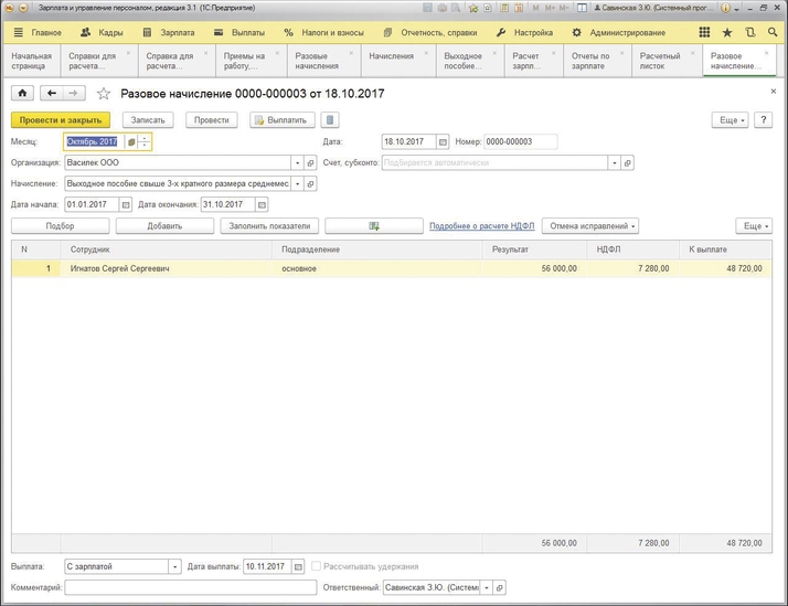Для осуществления начисления выходного пособия свыше трёхкратного размера среднемесячного .заработка в связи с увольнением сотрудника по сокращению штата сотрудников необходимо создать новый вид начисления («Настройки – Начисления – Создать»), отразить наименование начисления «Компенсация при увольнении» (выходное пособие свыше трёхкратного размера среднемесячного .заработка). Далее в закладке «Код» необходимо указать «Код вида расчёта» (он должен быть уникальным). В закладке «Основное» необходимо отразить назначение и порядок расчёта данного пособия. В разделе «Расчёт и показатели» указать фиксированной суммой. В закладке «Налоги, взносы, бухучёт» необходимо отразить «НДФЛ облагается код дохода 4800 «Иные расходы»», а также в разделе «Страховые взносы» указать вид дохода «Доходы, целиком облагаемые страховыми взносами» в закладке «Налог на прибыль» вид расхода по ст. 255 НК РФ отразить «Учитывается в расходах на оплату труда по статье» и выбрать пп. 9 ст. 255 НК РФ. Это необходимо отразить при начислении выходного пособия при увольнении сотрудника в связи с сокращением штата. Данный вид начисления осуществляется документом «Разовое начисление» (в разделе «Зарплата ‒ Разовое начисление»). В данном документе необходимо выбрать созданное начисление и заполнить документ по кнопке «Подбор». Начисление страховых взносов и НДФЛ осуществляется документом «Начисление зарплаты» (в разделе «Зарплата – Все начисления – Создать – Начисление зарплаты»). Проверить корректность расчёта данного начисления можно документом «Расчётный листок».