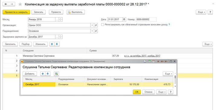 В разделе «Зарплата» выбираем документ «Компенсация за задержку зарплаты», либо в разделе «Выплаты» — «Компенсация за задержку зарплаты». Заполняем документ по кнопке «Создать». В поле «Задержана зарплата» указываем месяц, за который была задержка. По кнопке «Заполнить» документ заполняется автоматически. В результате табличная часть документа заполнится списком сотрудников, которым зарплату не выплатили своевременно. При заполнении документа определяются невыплаченные остатки зарплаты по состоянию на указанный месяц, в котором задержали оплату. Количество дней несвоевременной выплаты зарплаты подсчитываются автоматически. Датой отсчёта периода задержки считается дата, следующая за датой выплаты заработной платы в организации, указанной в настройках учётной политики. Кнопка «Изменить» нужна для того чтобы проанализировать и при необходимости отредактировать компенсацию сотрудника (рис.2).