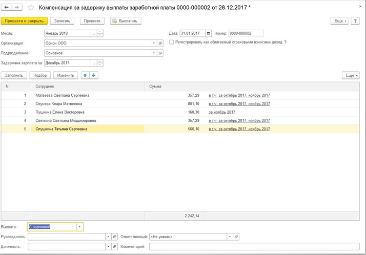 В поле «Выплата» указываем, когда планируется выплатить компенсацию за задержку зарплаты (рис.3):