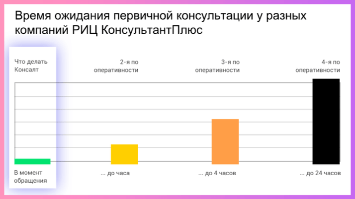 И у нас получилось! С 1 февраля 2018 года 85% ответов с линии консультаций стали приходить быстрее чем за 99 минут. А к концу 2018 года мы вышли на новый уровень: на 83% вопросов Клиенты получают первичную консультацию прямо в момент обращения. Такую оперативность не способна дать ни одна из компаний, работающих на российском рынке КонсультантПлюс.