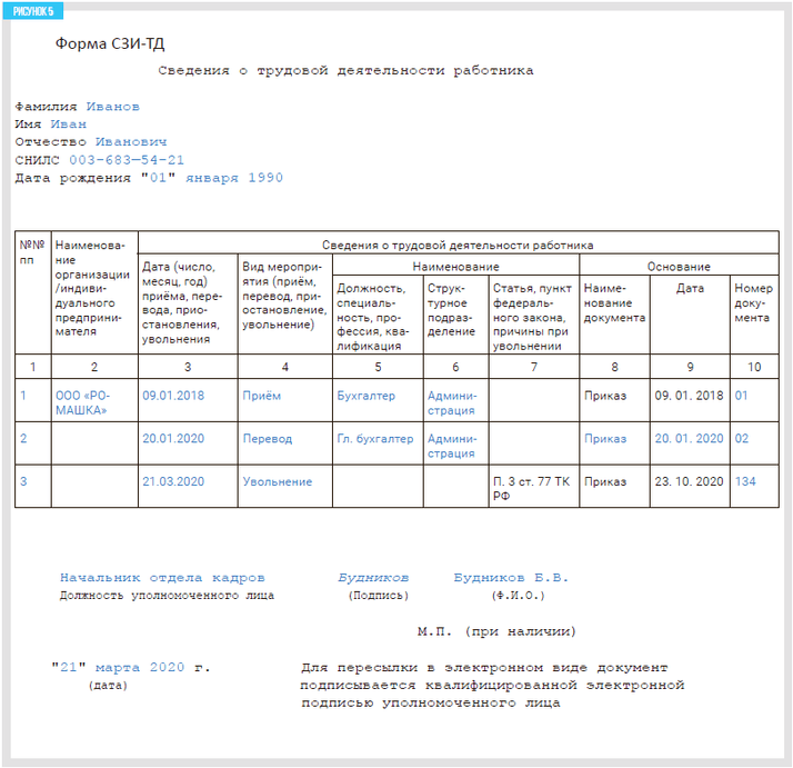 ПФР также подготовил форму СЗИ-ТД под названием «Сведения о трудовой деятельности работника». Этот документ-справку формирует сам ПФР по запросу граждан. Он содержит все события кадрового учёта в отношении человека, переданные его работодателем (работодателями) в ПФР (рис. 5).