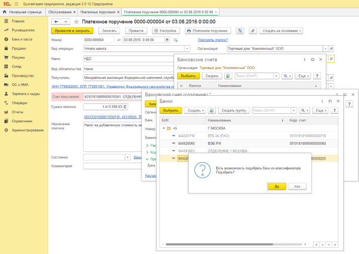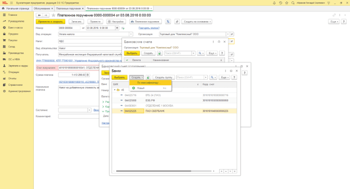 Чтобы обновить классификатор нужно вызвать его из любого документа, где фигурирует справочник «Банки», например через «Платёжные поручения». Открываем старое платёжное поручение или создаём новое.
