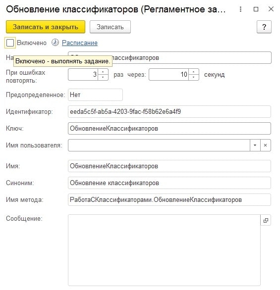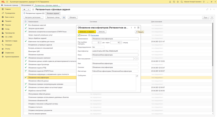 Закладка «Обслуживание» — «Регламентные операции» — «Регламентные и фоновые задания» — «Обновление классификаторов».