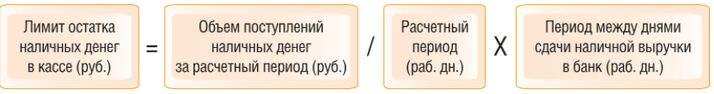 Формула для расчёта лимита кассы с учётом объёмов поступлений наличных денег выглядит следующим образом (п. 1 Приложения к Указанию № 3210-У):