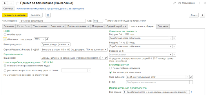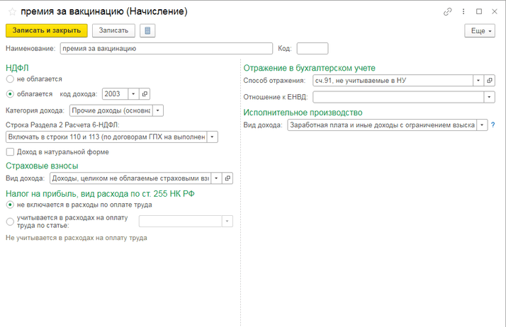 Сначала необходимо настроить новый вид начисления. Для этого переходим в раздел «Зарплата и кадры» — «Настройки зарплаты» — вкладка «Расчёт зарплаты» — нажимаем на ссылку «Начисления». Далее по кнопке «Создать» начинаем настраивать новый вид начисления (рис. 1). Задаём наименование, например «Премия за вакцинацию». В разделе «НДФЛ» выбираем: