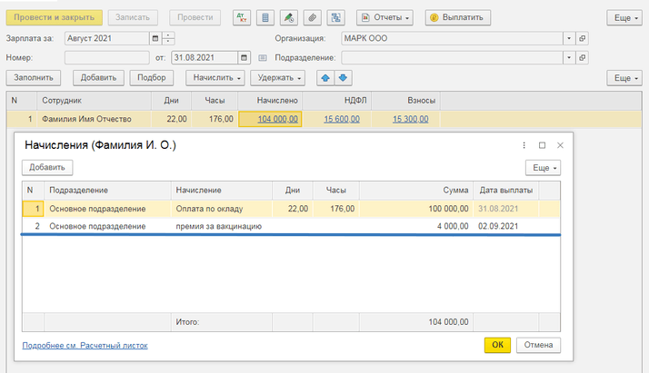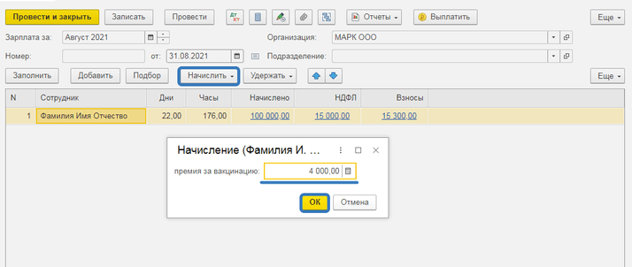 Перейдём к оформлению премии за вакцинацию в программе 1С:Зарплата и управление персоналом 8, ред. 3.1. В данной программе предусмотрены следующие действия.