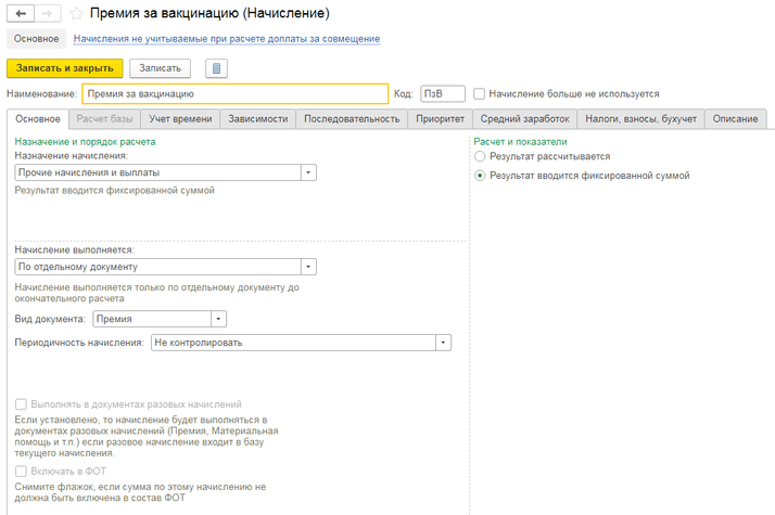 Сначала необходимо настроить новый вид начисления. Для этого переходим в раздел «Настройка» — «Начисления». Далее по кнопке «Создать» начинаем настраивать новый вид начисления. Задаём наименование, например «Премия за вакцинацию». На вкладке «Основное» задаём следующие настройки (рис. 5):