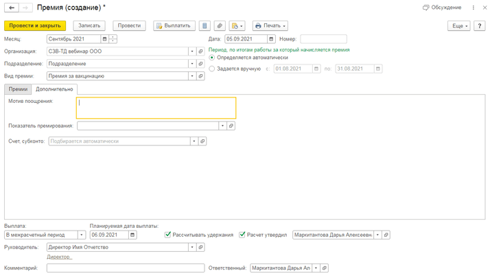 Если выплата происходит с авансом или зарплатой, то при создании соответствующих ведомостей на определённую дату программа автоматически заполнит начисленную сумму премии в данных документах выплат.