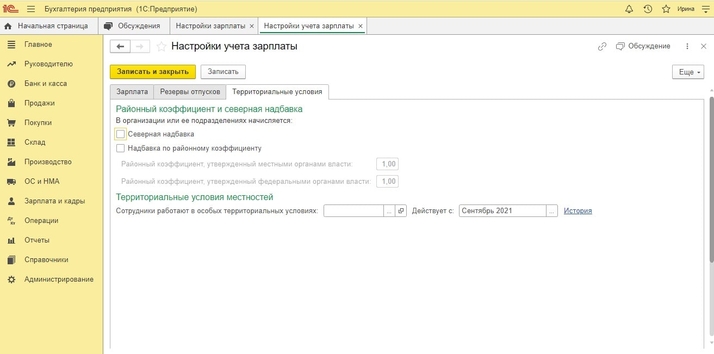 В открывшемся окне появится форма настроек, состоящая из трех закладок: «Зарплата», «Резервы отпусков», «Территориальные условия».