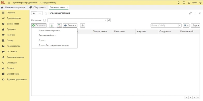 Чтобы создать новое начисление зарплаты в программе, нажмем на кнопку «Создать». Откроется пустая форма документа, которую необходимо заполнить.