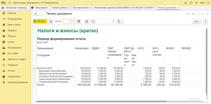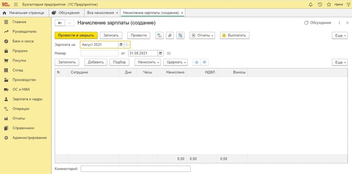 Для более наглядного примера, предположим, что у нас есть небольшая фирма, которая занимается торговой деятельностью и имеет немногочисленный штат сотрудников. Выполним начисление зарплаты работникам предприятия за август.