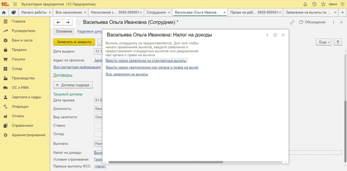 Внесение изменений по начислению налога выполняется через личную карточку сотрудника. Рассмотрим пример подачи заявления на стандартные вычеты из НДФЛ для сотрудников, имеющих несовершеннолетних детей.